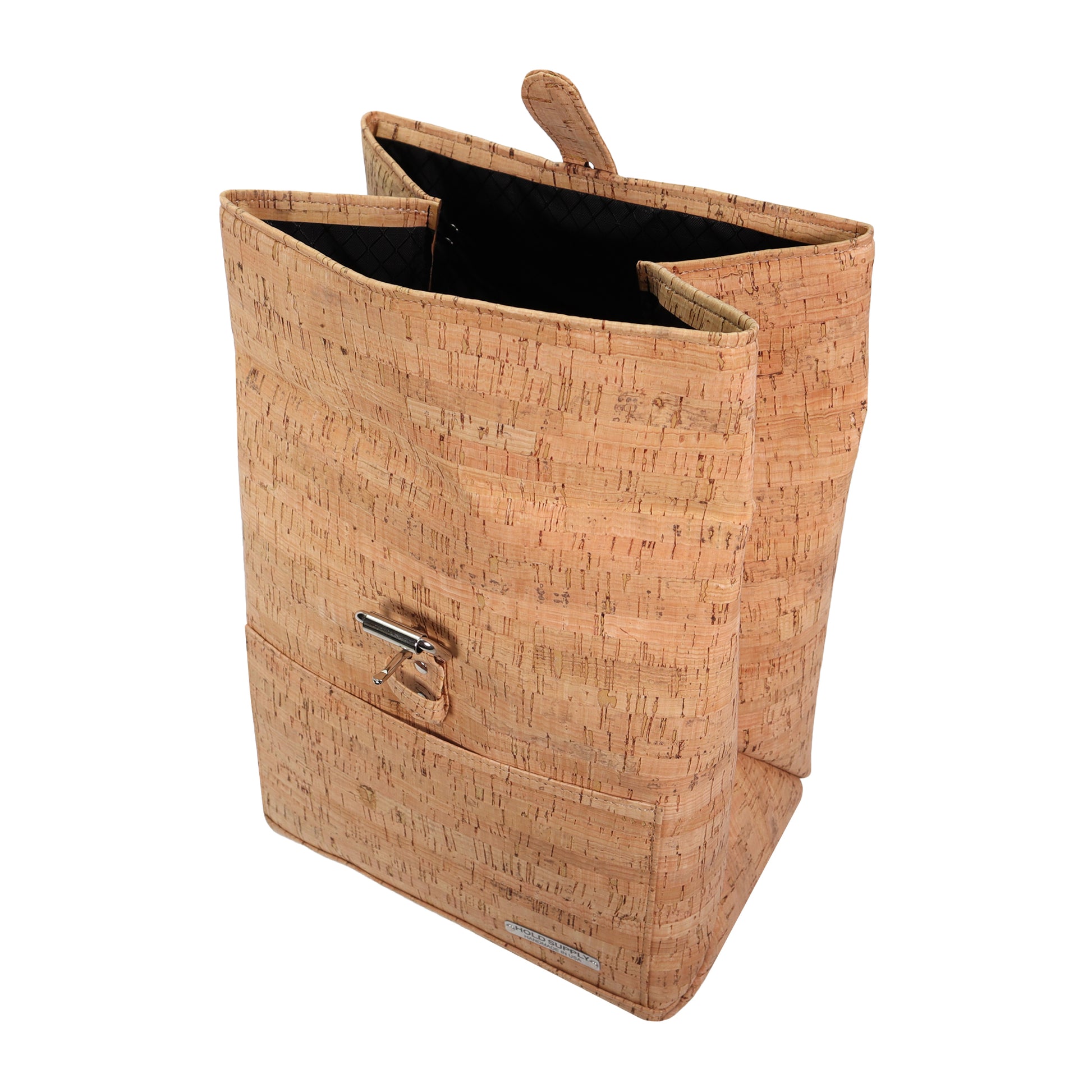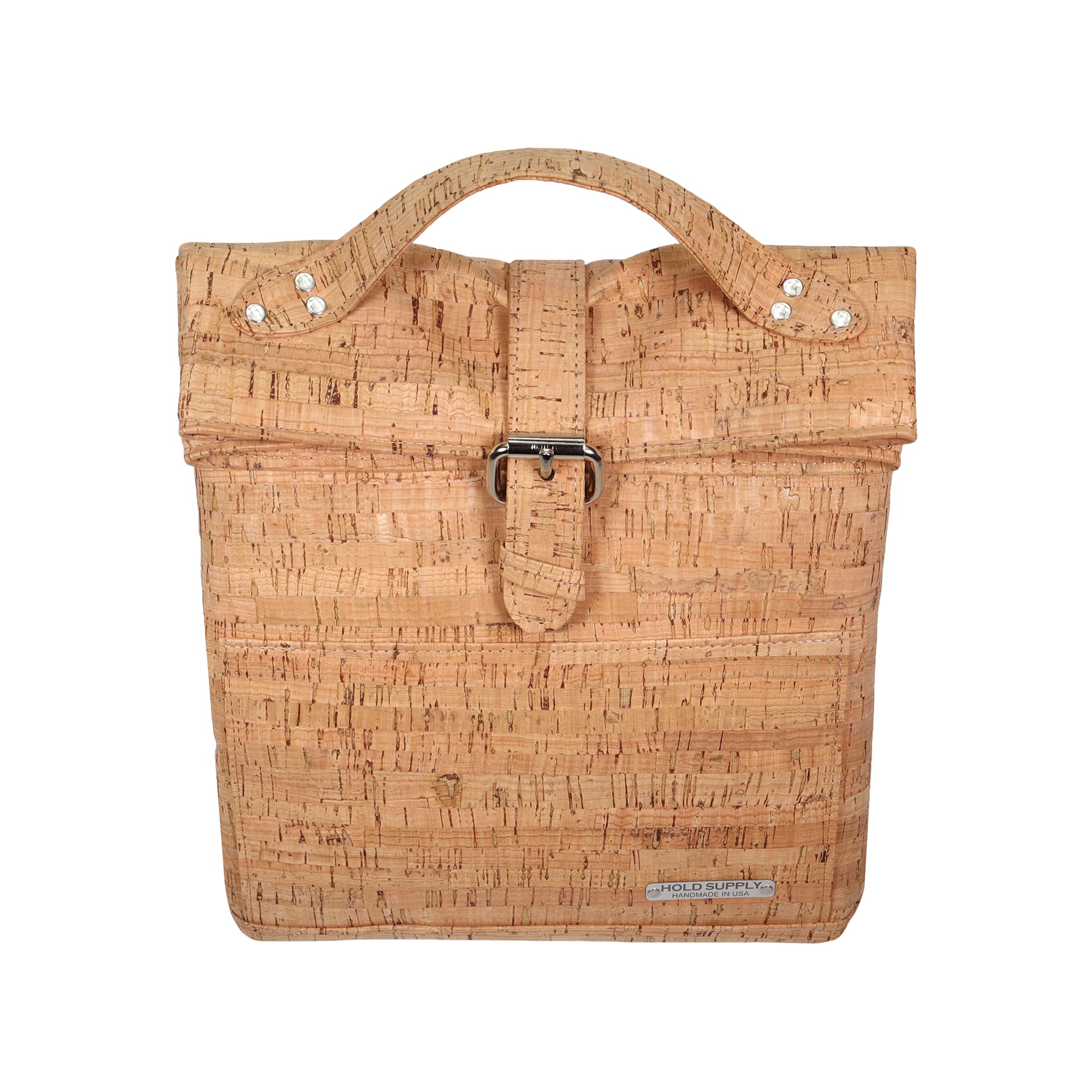 This artisan made fold top lunch bag is the perfect alternative to traditional flimsy, mass produced lunch bags found everywhere else. This timeless, unique design features a fold top, buckled closure, front pocket for extra napkin/ utensil storage, and riveted reinforced cork straps. With a closed size of 10” tall x 9.5” wide x 7.25” deep, this insulated lunch bag has the perfect amount of space to pack a meal for one or two people.